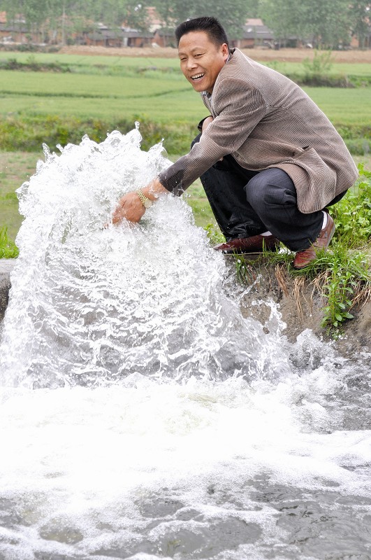 4月26日,环潭镇廖寨村五组楼子湾一级抽水现场,水小河沟旁,经水泵抽水,白花花的水柱喷涌而出,守候在出水口的村民张启明,抱着管口脸上笑开了花。