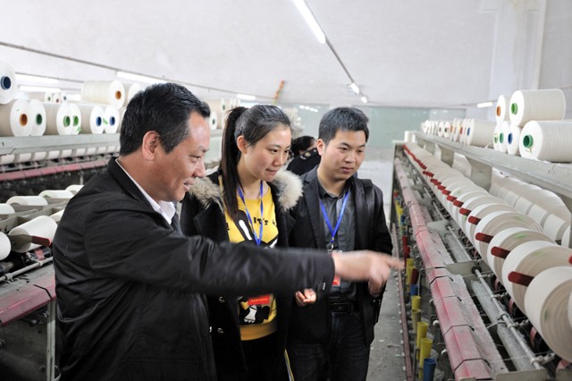 4月22日,随县两名大学生“村官”在随县开发区雄丰布业公司生产车间了解生产情况。为了帮助大学生“村官”尽快掌握经济社会管理能力,促进大学生“村官”更快成长,随县分批组织大学生“村官”到企业、机关进行各项体验和学习。 (本报记者 李文军 摄)