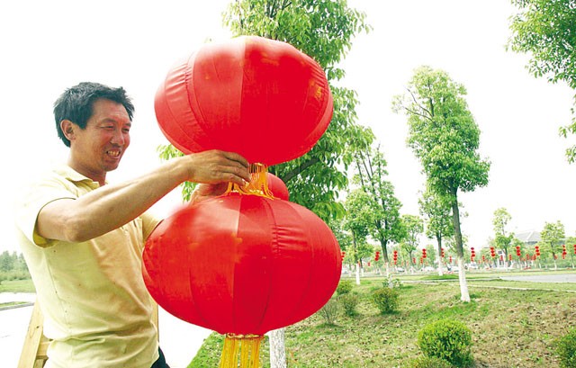 五月十三日,工人们在炎帝大道悬挂大红灯笼,将道路装扮得喜气洋洋。(本报记者 孙洪涛 摄)