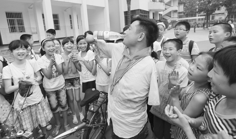 近日,曾都实验小学请无臂游泳冠军李丰强到校作“身残志坚,永不言败”的励志演讲,学生们感动地说:“李叔叔那个大的困难都克服了,我们还有什么困难克服不了!”图为学生见李丰强用残肢骑车、喝水,钦佩地鼓起掌来。(