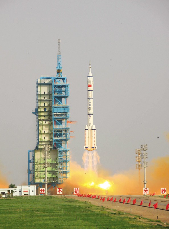 18时37分,托举神九飞船的长征二号F遥九火箭在巨大的轰鸣声中,从酒泉卫星发射中心腾空而起。西斜的大漠阳光,将58.3米的船箭组合体的投影印在苍茫戈壁滩上。