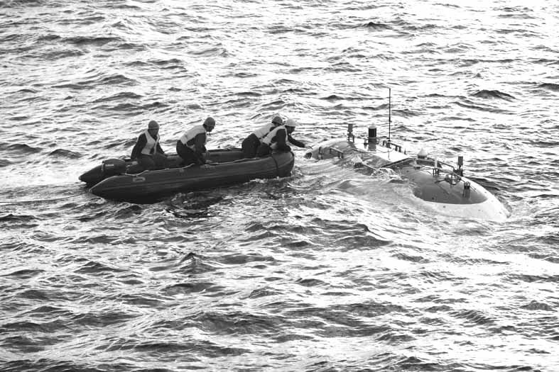 6月19日,正在太平洋马里亚纳海沟区域进行7000米级载人下潜试验的 “蛟龙”号成功完成第二次下潜任务,开展了近底巡航和照相、摄像,海底微地形地貌测量,并坐底完成了沉积物、水样取样,标志物布放等作业,最大下潜深度6965米。据了解,第二次下潜试验是“蛟龙”号7000米级海试中非常关键的一次试验,主要任务是复核潜水器在第一次下潜试验中故障排除的效果,继续验证潜水器在6000米深度的各项功能和安全性。图为工作人员在回收“蛟龙”号。(新华社发)