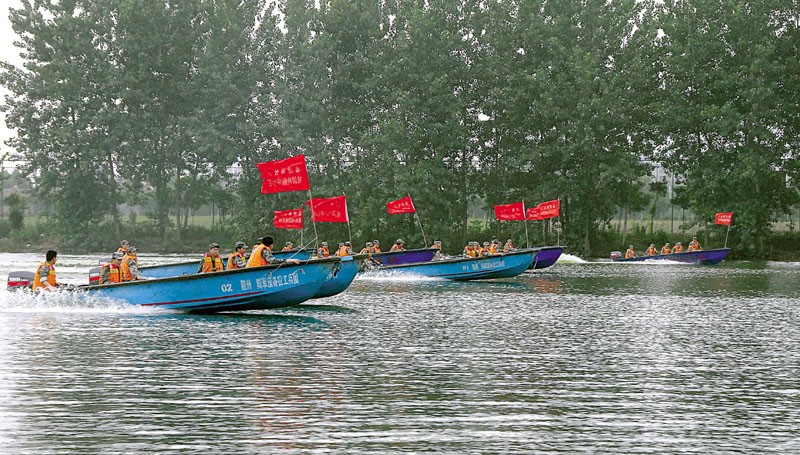 连日来,曾都区防办会同区人武部,组织民兵预备役官兵在白云湖举行水上救护演练。此次演练从实战出发,结合该区河道堤防等防洪工程现状及可能发生的汛情险情特点,增强防汛抢险实战的能力。 (本报记者 唐天才 通讯员 李一勤 摄)