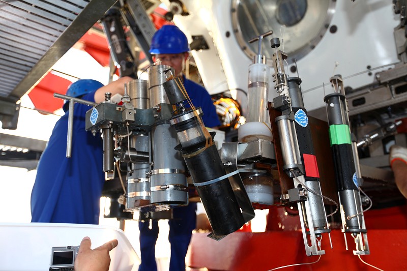 6月22日,“蛟龙”号完成7000米级海试第三次下潜试验,安全返回母船。潜水器最大下潜深度6963米,并取得3个水样、3个沉积物样,拍摄到海底生物并取回一个生物样品。25日,“蛟龙”号有望正式冲击7000米。图为返回的“蛟龙”号上的取样装置。