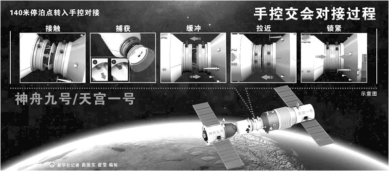 12时48分,对接机构成功接触。12时55分,一个多小时前刚刚分开的神舟九号与天宫一号实现刚性连接,再次形成组合体,中国首次手控空间交会对接试验成功。