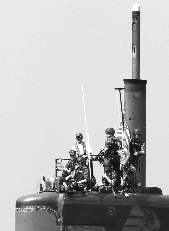 菲律宾军方25日宣布,美国“路易斯维尔”号核潜艇当天抵达菲北部苏比克湾港进行“例行访问”。“路易斯维尔”号是美海军“洛杉矶”级攻击型核潜艇,具有完善的电子对抗设备,最大探测距离可达180公里。图为美军士兵在核潜艇顶部观望。 (新华社发)