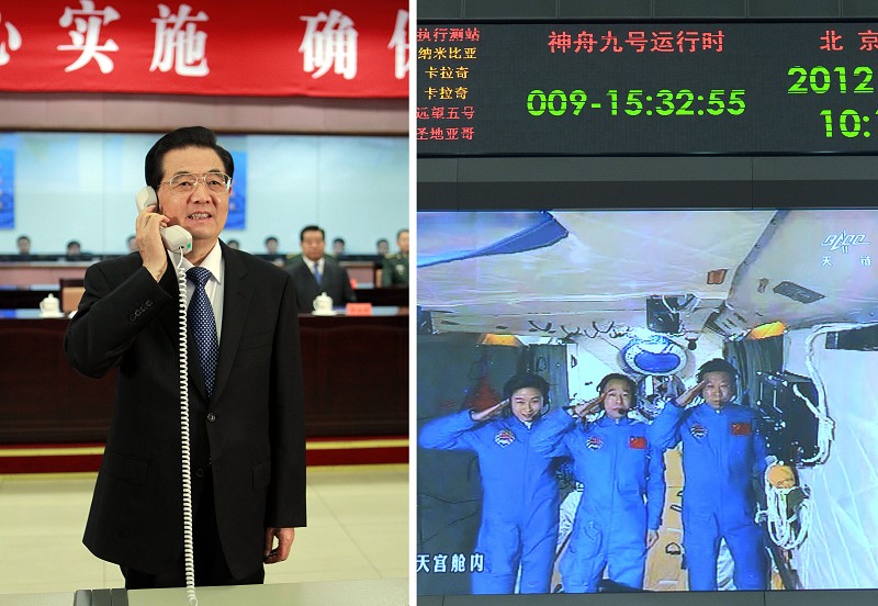 新华社6月26日电 26日上午10时许,中共中央总书记、国家主席、中央军委主席胡锦涛在北京航天飞行控制中心,同神舟九号航天员景海鹏、刘旺、刘洋亲切通话。