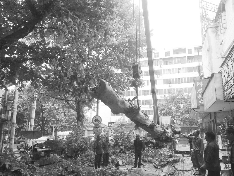 六月二十八日上午,园林部门人员在随城乌龙巷一花店门前清理一棵倒地的大树。据现场工作人员介绍,一辆车经过时,挂折了这棵已空心的树,树歪在路上,影响了通行。(本报记者许静摄)