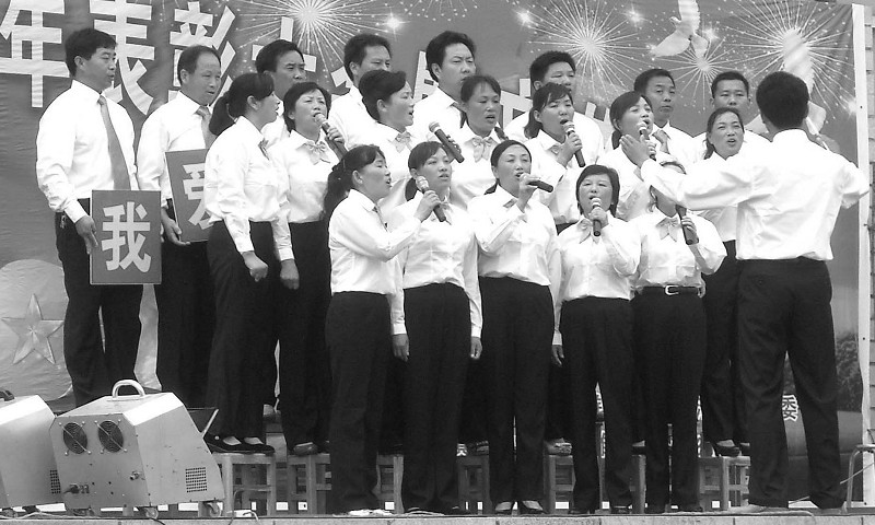 随县淮河镇小学每年都举办校园文化节,来展示师生的才艺。今年的校园文化节,举行有文艺汇演、校园集体舞等,丰富多彩。图为是教职工在校园文化节上唱红歌。(本报记者金鸣摄)
