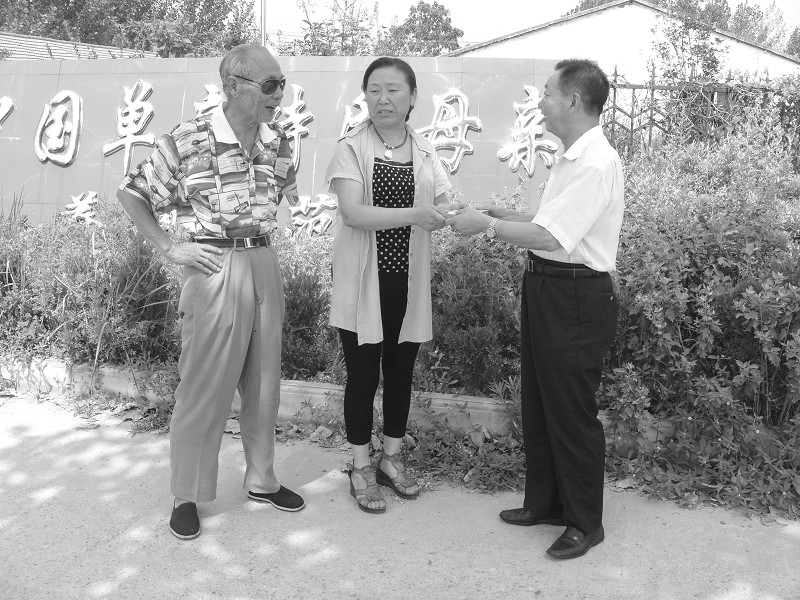 七月四日,市老促会会长吴治炎(右一)给广水市单亲母亲养殖合作社总经理刘家翠(中)送去一万元帮扶款,以帮扶更多的贫困单亲母亲脱贫致富。(通讯员石守京摄