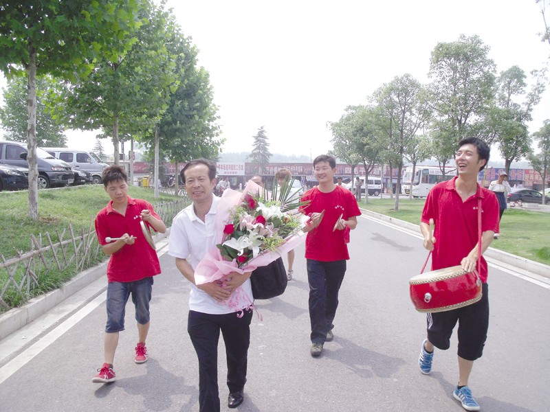 冰姿·三梦公司何楠勤奋工作,默默奉献,长期坚守在生产第一线,近日被市工会推选到省工会参加2012年农民工去北戴河等地休养。图为公司员工欢送何楠出发去休养。 (通讯员 向阳 摄)