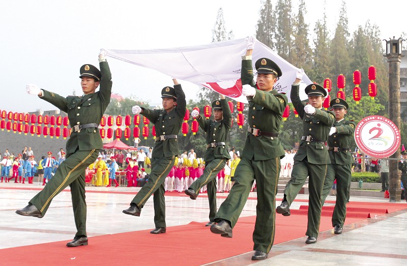 昨日,曾都区举行第二届全民健身运动会开幕式。图为武警战士高擎运动会会旗迈入开幕式现场。(本报记者 张顺 摄)