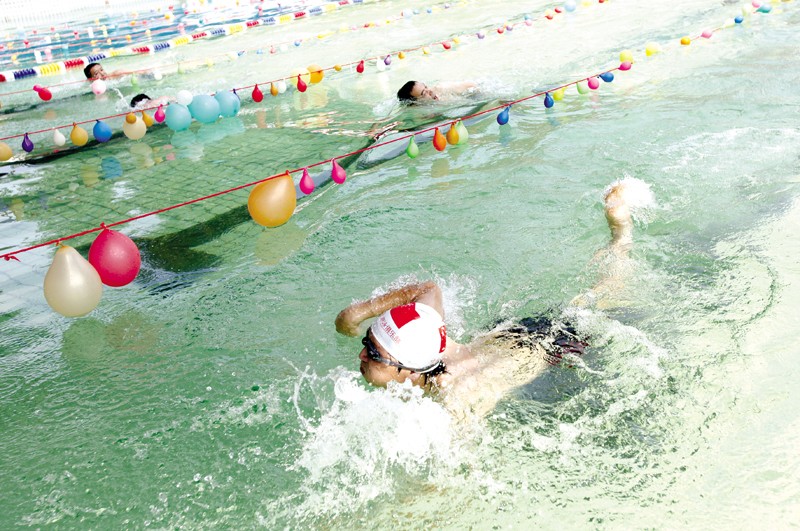 昨日,曾都区第二届全民健身运动会游泳比赛在随州一中游泳馆举行。图为选手们在决赛中奋力向终点冲刺。 (本报记者 张 顺摄)