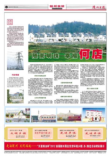 走读何店 “何店”之名缘自明代中晚期本地何姓出何思泉(明少傅·翰林院编修文林郎)、何宗彦(少师兼太子太师,吏部尚书、建极殿大学士、赠太傅,谥文毅)两大历史名人,而称“何家店”,后简称“何店”。 走读随州,发现福地。“楼台倒映、湖心映月、水夹桃园、隔山引泉、文阁耸翠、梅花古堰、松盘虬龙、旅店朝烟”八大古景引人入胜,何店、浪河两大工业园区引凤来栖,随安(随州至安陆)、随柳(随州至柳林)两条公路贯穿全镇,“麻竹”高速、“汉十”高速公路直切集镇中心…… 何店优越的位置,宽阔的地域,便利的交通,为招商引资、发展经济具备了得天独厚的条件,魅力四射生机勃勃的青春何店前程似锦。 何店素描 何店镇位于随州市近郊,与柳林镇,均川镇,洛阳镇,南郊区相邻。距随州市区中心15公里,距汉丹铁路和316国道14公里。镇辖18个行政村,2个居委会。东西宽15公里,南北长24公里。5.1万人口,版图面积216平方公里,折合32.4万亩,其中山场21.2万亩,水域3万亩,耕地5.2万亩,街道村庄3万亩。概称“七山一水二分田”。 何店镇党委政府团结和带领全镇人民,始终把发展作为“第一要务”,把稳定作为第一责任,把依法行政作为第一要求,坚持以人为本,执政为民,全面贯彻落实科学发展观,开拓进取,奋力拼搏,实现了“三个文明”建设的新成绩。农业产业化步伐加快,农民收入大幅上升。浪河食品工业园、何店工业园建成投产,一镇两园比翼齐飞,成为农村城镇化的 “助推器”、何店经济快速发展的“推进器”,何店已成为“食品茶叶香天下,化工机械红九洲”的随南明珠重镇。 历史文化源远流长 “明少傅,翰林院编修文林郎”何公思泉墓葬位于镇区何家享堂,其神道双石狮尚存;清道光二十一年,奉直大夫杨代瑛及其妻“皇清诰封五品宜人”吕氏夫妇合葬墓位于镇内三岔湖村,且有皇上御赐“文官下轿、武官下马”圣旨龙碑;大清道光四年特授随州正堂滇南窦欲峻撰文,州痒生何秉经书刻赞偿“?议军功理问杨君开泰”捐田捐房办义学的《喻羲君子》碑收藏于何店文化站,并列入随州市 “百部碑文集”;1979年12月,在域内何家台发掘出土西周文物47件,现收存入随州市博物馆。发现新石器时期古遗址12处。 境内有远古闻名“仙翁对弈”的仙境圣地棋盘山,有明代传说天下“金头玉葬”“四十八享堂”之一的何阁老享堂,有清代立于九碑十湖三十二大堰中十湖之一——三岔湖旁的 “文官下轿,武官下马”的《圣旨》龙碑,还有颇具观赏价值的“千年九头柏”、“万年宝塔青”、“鸡冠抱黄连”等许多人文自然景观,可谓地灵人杰,是旅游观光,怀古憧今,陶冶情操的上佳去处。 山清水秀资源丰富 全镇总面积为218.77平方公里,其中山场面积19.8万亩,水域1.7万亩,耕地6.26万亩,概称“七山一水两分田“。森林覆盖率95.5%。东北丘陵起伏,西南群山环绕,植被优良,土质肥沃,气候温和,光照充足,雨量充沛,年降雨量1309毫米。水域宽阔,水源充足。有5000万立方米的中小型水库26座,以白果河水库至浪河为主流的河流6条全长80公里,形同“凤爪”,贯穿全镇。适宜农、林、牧、副、渔、工、商、运、建、服务等多行多业生产与发展。是随州市农业大镇,养殖重镇。 何店资源丰富,特产众多。矿产资源有总储量达600余万吨的重晶石,含钡量高达94%以上,年开采量3万吨以上;有储量1000万吨以上的石灰石,年产石灰5万吨,素有“石灰大王”、“石灰之乡”之美称;农特资源有万亩银杏,3万亩板栗、万亩茶园、万亩大蒜、万亩精养鱼池,10万头瘦肉猪,千吨食用菌,千万只家禽等八大商品生产基地。尤其是有“活化石”之称的古银杏群落,有“怪茶”之称的“棋仙峰”茶叶等许多享誉天下的土特产,堪称物华天宝,是志士商贾开创基业,大展宏图的理想场所。 交通便利通讯畅通 随安(随州至安陆)、随柳(随州至柳林)两条公路贯穿全镇,“麻竹”高速、“汉十”高速公路直切集镇中心,汉十高速公路随州连接线直达316国道和武襄(武汉至襄樊)铁路,将何店镇和随州市区融为一体。 程控电话直拨国内外,移动、联通通讯覆盖全境;金融机构与全国联网,汇路畅通,结算方便,信贷灵活;万吨自来水厂和220千伏安变电站可满足镇区工企业生产和居民日常生活之所需。 政策优惠环境宽松 近年来,何店镇深入贯彻落实科学发展观和“工业兴市”战略,紧紧围绕工业强镇的发展思路,努力实践“工业经济是第一要务,招商引资为第一政绩”的发展理念,充分利用区位优势、资源优势、人才优势、劳动力优势,因地制宜,抢抓机遇;创优策略,强攻招商;全方位、多层次、多渠道的开展招商引资工作,营造了“大招商,招大商,招好商”的浓厚氛围。 抓好招商工作,软环境改善至关重要。何店镇从实际出发,以项目为支撑,以园区建设为载体,以打造招商引资平台为重点,强化工作措施,落实优惠政策,激励搞活招商工作。镇委、镇政府认真贯彻落实科学发展观,开拓创新,与时俱进,迈开了全面建设小康社会的豪迈步伐。重点实施“开放兴镇、人才兴镇、工业兴镇”战略,大力开展招商引资,坚决执行随州市、曾都区《关于鼓励各类投资的若干规定》和《关于加快民营经济的决定》,以政策、法规形式保护投资者合法权益,竭力为投资者创造一个开放、文明、优美、安全、保障的投资环境。 今年以来,何店镇招商引资工作硕果累累