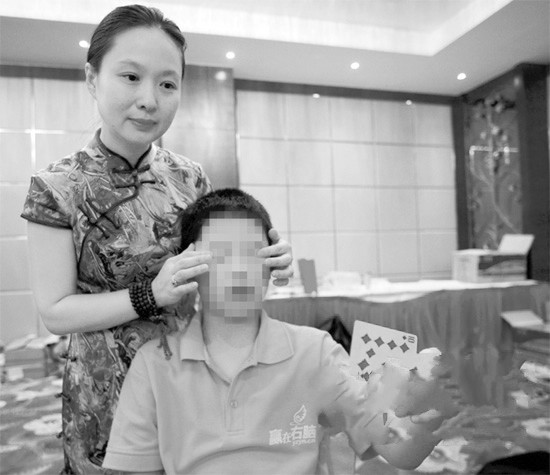 雷雅茹的初级班课程分为两部分,先背圆周率,再学蒙眼识字。“呼吸,再呼吸,闭眼呼吸,慢慢会有光进来……”孩子们在她的带领下把窄窄的布条蒙在眼睛上,开始感知扑克牌的颜色,在她的不断“鼓励”下,孩子们似乎在短时间里就纷纷学会了这项“神奇”的功能。来自海南省海口市的培训班学生家长万先生接受记者采访时说,最初他对孩子脑力开发的培训还是赞同的,所以把11岁的女儿送到了上海。