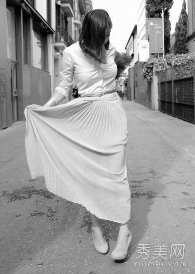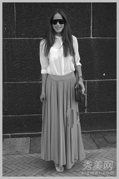 白衬衫基本百搭,几乎人手一件。优雅素净的白色给人清新的感觉,搭配裸色系长裙,将衬衫衣摆塞进腰间,更能凸显曼妙身姿。