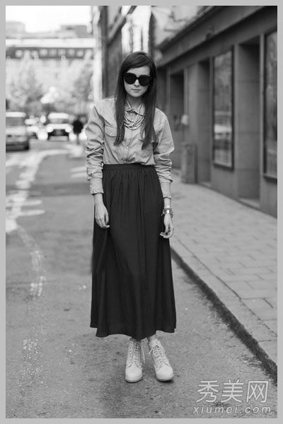 帅气个性的牛仔衬衫,长袖款式,秋季必备。选择深紫色的复古长裙来搭配,简约大气,时尚好看,带点清新的味道,散发着欧美的大牌的气场。