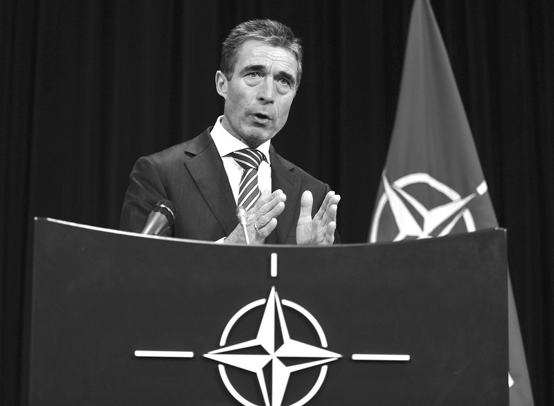 10月9日,在比利时首都布鲁塞尔召开的北约国防部长会议首日结束后,北约秘书长拉斯穆森出席新闻发布会。拉斯穆森当天呼吁国际社会向叙利亚政府施加更大压力,从而促成解决危机的政治方案。 (新华社发)