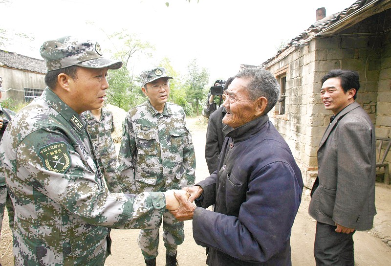 10月12日,随州军分区主要负责人一行来到广水市,看望老战士、老党员、老干部,并将军分区全体官兵捐赠的3万元现金送到城郊乡星何村等地,用于当地发展经济。(本报记者 孙洪涛 摄)