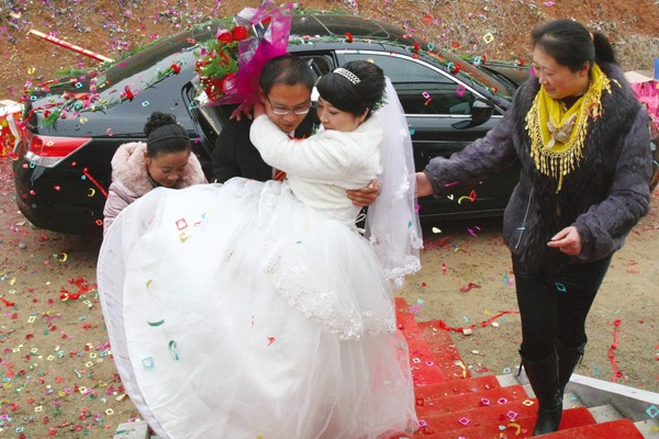 西式婚纱,中式婚俗。近日,随县的一对新人在“牵新娘子”的导引下,新郎抱着被脱掉鞋子的新娘步入洞房,随后的“红枣茶”、“长寿面”、“蜂子蜇手”、“公公扫地”将婚礼闹得红红火火。 (本报记者 张 顺摄)