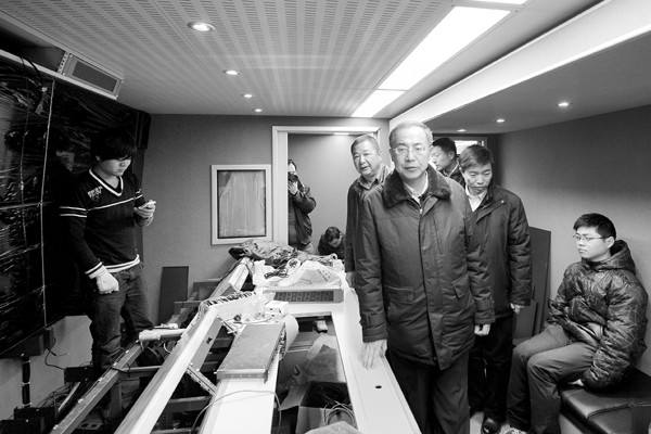 齐星公司抓住“特”字作好文章,今年1至11月共生产销售广播电视转播车、采血车等80余辆特种车,销售额达1.4亿元。图为国家工信部领导正在该公司视察电视转播车生产线。 (本报记者 李文军 摄)