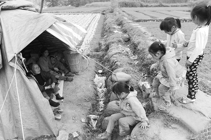 图片3-灾区民众自发在田坎上搭建简易帐篷