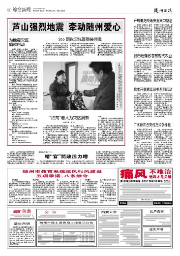 据悉,为帮助受灾同胞战胜灾害,目前市红十字会和市慈善总会都已经发出救助四川雅安地震倡议书,呼吁随州各界汇聚爱心、援助灾区。同时,鉴于目前运输条件所限,相关慈善机构呼吁市民尽量以现金方式捐助。市红十字会将按照有关规定,对捐赠款物的募集和使用情况进行网上公示;市慈善总会也表示此次捐助活动全程接受社会各界的监督,所得善款将专项用于芦山地震灾区。