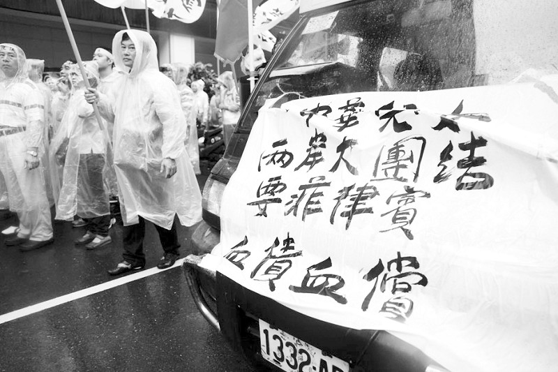台湾数百渔民冒雨在台北马尼拉办事处前集会抗议,小卡车上挂着“中华儿女 两岸大团结 要菲律宾血债血偿”的标语。