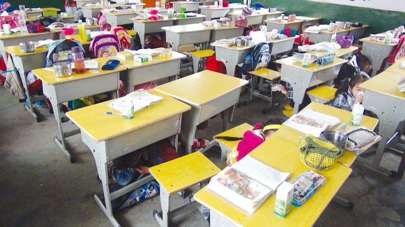 日前,随县洪山镇小开展了一次模拟地震的应急疏散演练活动。图为演练现场学生们躲藏在课桌下的情景。(付中武 余贤刚 摄)