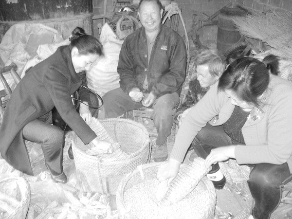 10月18日,民主建国会随州市委员会副主委肖英(左一),到曾都区万店镇新东村二组看望66岁空巢老人黄万能,同他一起为玉米脱粒,并就农村养老问题进行调研。 (本报记者 多 思摄)