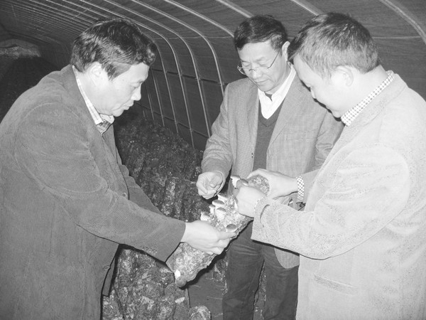 ◆11月13日,曾都区科协邀请省农科院研究员周明(中),到洛阳镇九口堰指导获省重大科技成果奖的大棚菇稻模式项目生产。