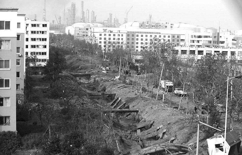 11月22日凌晨2时40分,中石化青岛开发区输油管线破裂造成原油泄漏,流经约2公里的地下雨水涵道后入海。10时30分左右,雨水涵道和输油管线抢修作业现场相继发生爆燃,沿线道路路面严重受损,并引起流入海湾原油燃烧。