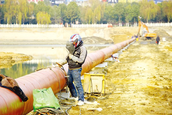日前,城南污水处理厂污水收集管道从滨湖湾附近穿越白云湖,将在白云湖南岸接入污水收集管网。图为施工人员正在焊接污水管道。(本报记者徐斌摄)