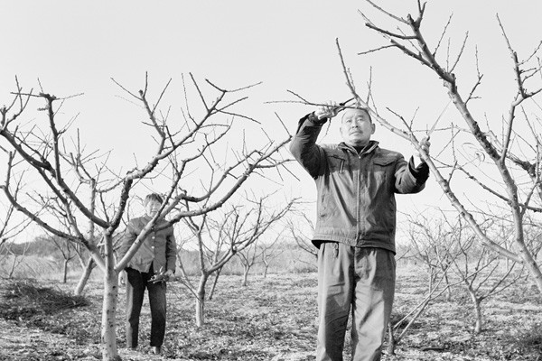 随县唐县镇大力发展油桃产业,全镇油桃面积达3万余亩。图为该镇华宝山村果农郑仁国夫妇正在自家8亩果园里为油桃剪枝。 (本报记者 李文军 摄)