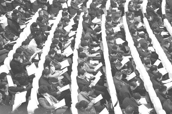 与会代表、委员认真听取政府工作报告。(本报记者 徐斌摄)