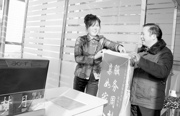 随城下岗女工周宇玲干起了月嫂,热情周到的服务获得了客户的好评。图为1月22日,客户家属将锦旗送到她的公司。 (本报记者 徐 斌摄)