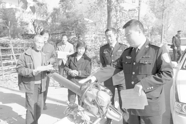 针对群众反映强烈的偷砍滥伐、无证运输栎杂树现象,淮源森林派出所加大巡逻盘查力度。图为民警正在殷店镇谢家湾村巡逻向群众散发宣传资料