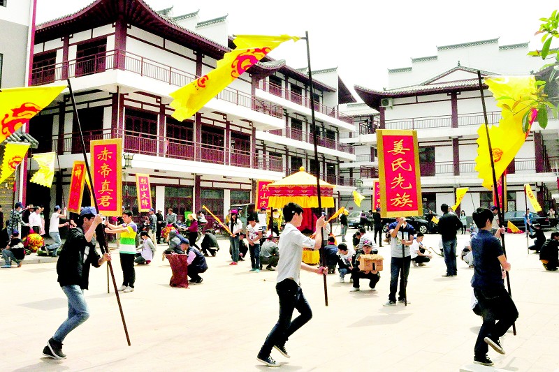 5月5日,随县文体局组织演出人员正在排练“神农大阵”。目前,随县正积极排练各种文艺节目,为甲午年世界华人炎帝故里寻根节文化庙会作准备。 (本报记者 李文军 通讯员 龚承斌摄)