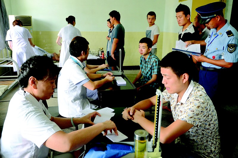8月1日,我市征兵体检开始,全市3200名适龄青年踊跃报名(其中大学生546人)。图为曾都区正在进行新兵体检。 (本报记者 李文军 通讯员 裴作明摄)