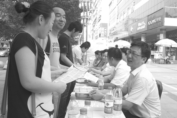 8月1日,市邮政管理局和相关快递企业员工走上街头,宣传《湖北省邮政条例》。 (记者 钟克波 摄)