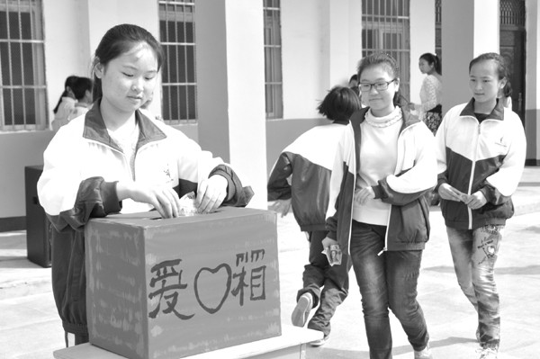 9月23日,随县厉山镇第二小学和厉山镇第三中学学生走进随县特殊教育学校,开展了生动活泼、丰富多彩的联谊活动。同时,学生们还将平时积攒的零花钱,纷纷投向爱心捐助箱,为这里的残疾学生献上一份爱心。 (本报记者 陈德友 通讯员 刘承敏 摄)