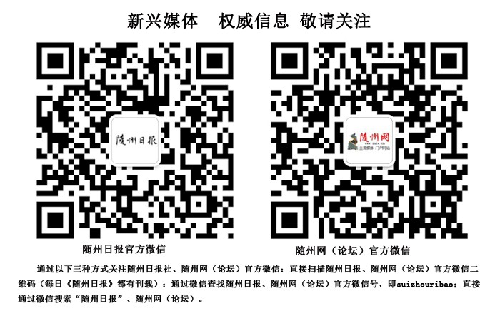 通过以下三种方式关注随州日报社、随州网(论坛)官方微信:直接扫描随州日报、随州网(论坛)官方微信二维码(每日《随州日报》都有刊载);通过微信查找随州日报、随州网(论坛)官方微信号,即suizhouribao;直接通过微信搜索“随州日报”、随州网(论坛)。