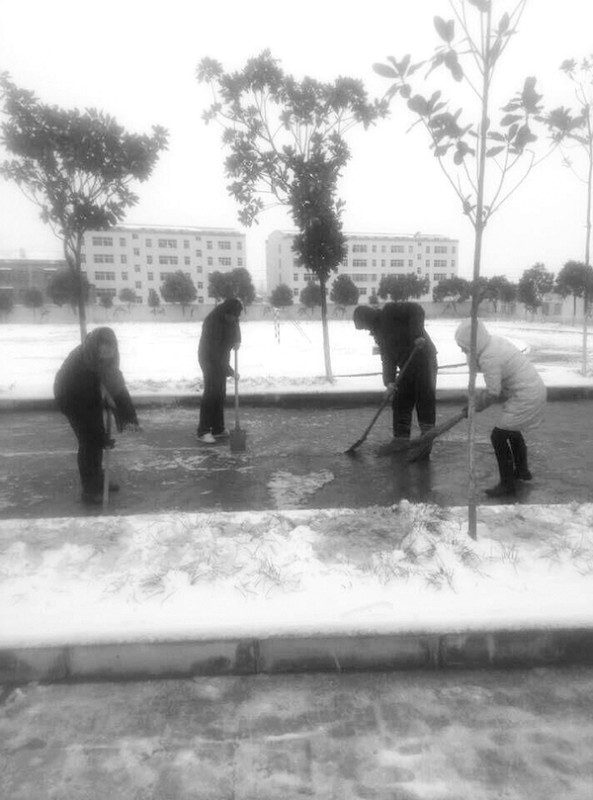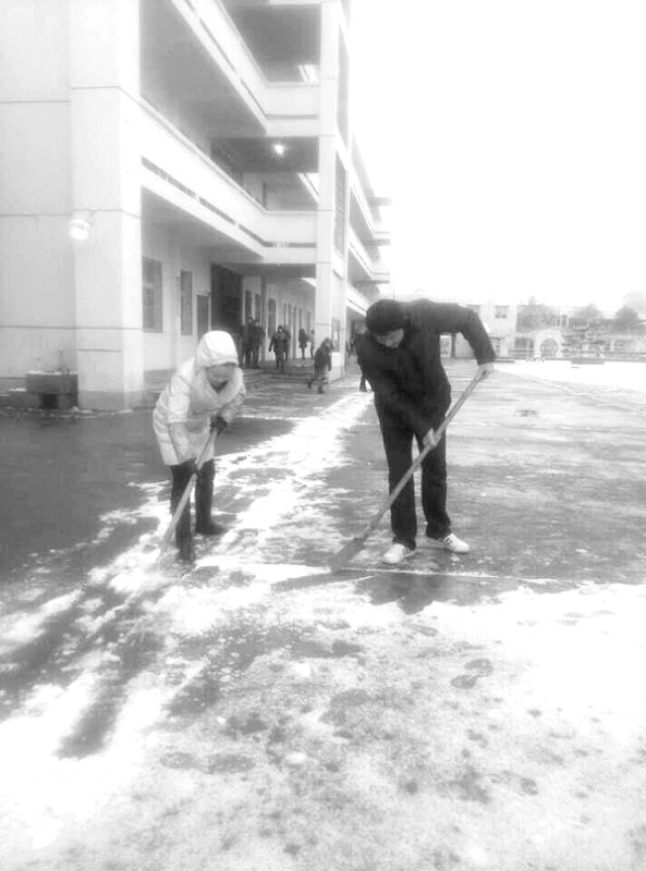 1月28日,我市迎来今年第一场雪,为确保学校师生出入安全,确保正常的教学秩序,随县尚市镇中心学校迅速启动“抗雪防冻应急预案”,建立了抗雪防冻工作小组,执行24小时值班制度,应急小分队及时清扫积雪,铲除冰冻。并在人流出入密集的地方,铺设防滑垫、纸板,做好防滑工作。 (通讯员 付 义摄)