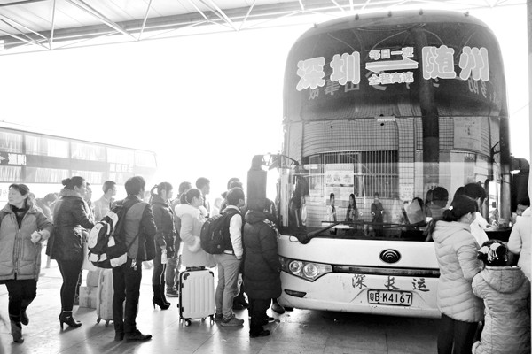 2月24日,春节假期最后一天,随州汽车站出现节后返流高潮。随州车站当天发往深圳、上海等地长途客车近百台次。 (记者 李文军摄)