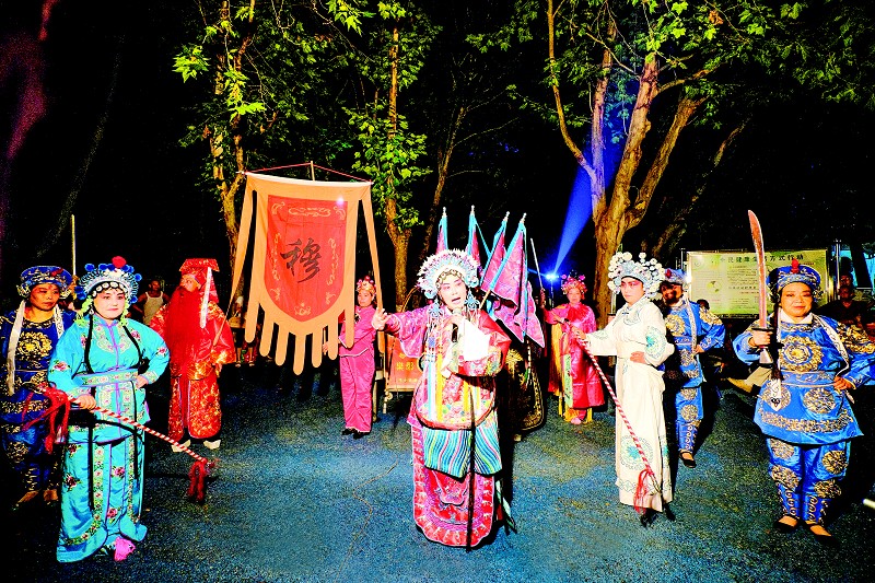 7月18日晚,由随州市老年大学和市曲艺家协会共同排练的纪念抗战70周年曲艺节目《穆桂英挂帅》在市神农公园义务演出,让广大戏迷们大饱眼福。 (记者 李文军摄)