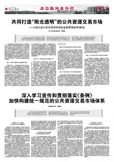 市人大常委会副主任 袁慧敏 将于8月1日正式施行的 《湖北省公共资源招标投标监督管理条例》(以下简称条例),是全国省级人大常委会首部对公共资源招投标监督管理单独进行立法的地方性法规