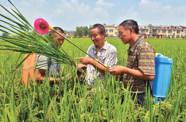 随州高新区淅河镇农业技术服务中心分成6个病虫防治指导小组,深入全镇48个村的田间地头指导农民抓好三代三化螟、稻纵卷叶螟的防治工作。(本报记者 孙洪涛 通讯员 王涛 摄)
