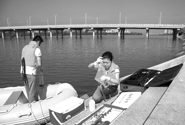 8月11日,市水文局开展突发事件水文应急演练。图为水文应急队员在白云湖进行水样检测。(记者 徐斌 通讯员陈蔓摄)