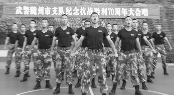 9月1日,武警随州支队举行大合唱,纪念抗战胜利七十周年。图为武警官兵表演《黄河大合唱》。(本报记者 徐斌 摄)