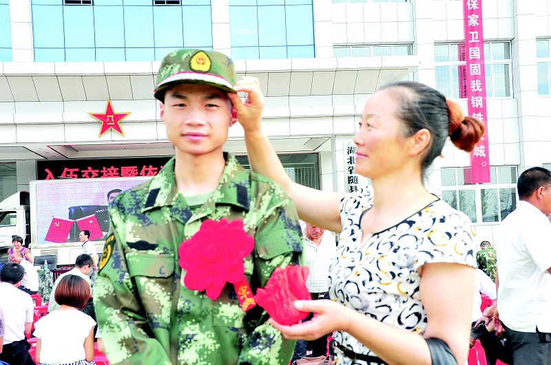 9月10日,随县起运2015年秋季首批应征入伍新兵。在新兵入伍交接仪式上,来自随县安居镇的妇女高小林(前排右),为新入伍的儿子出征前整理军容。